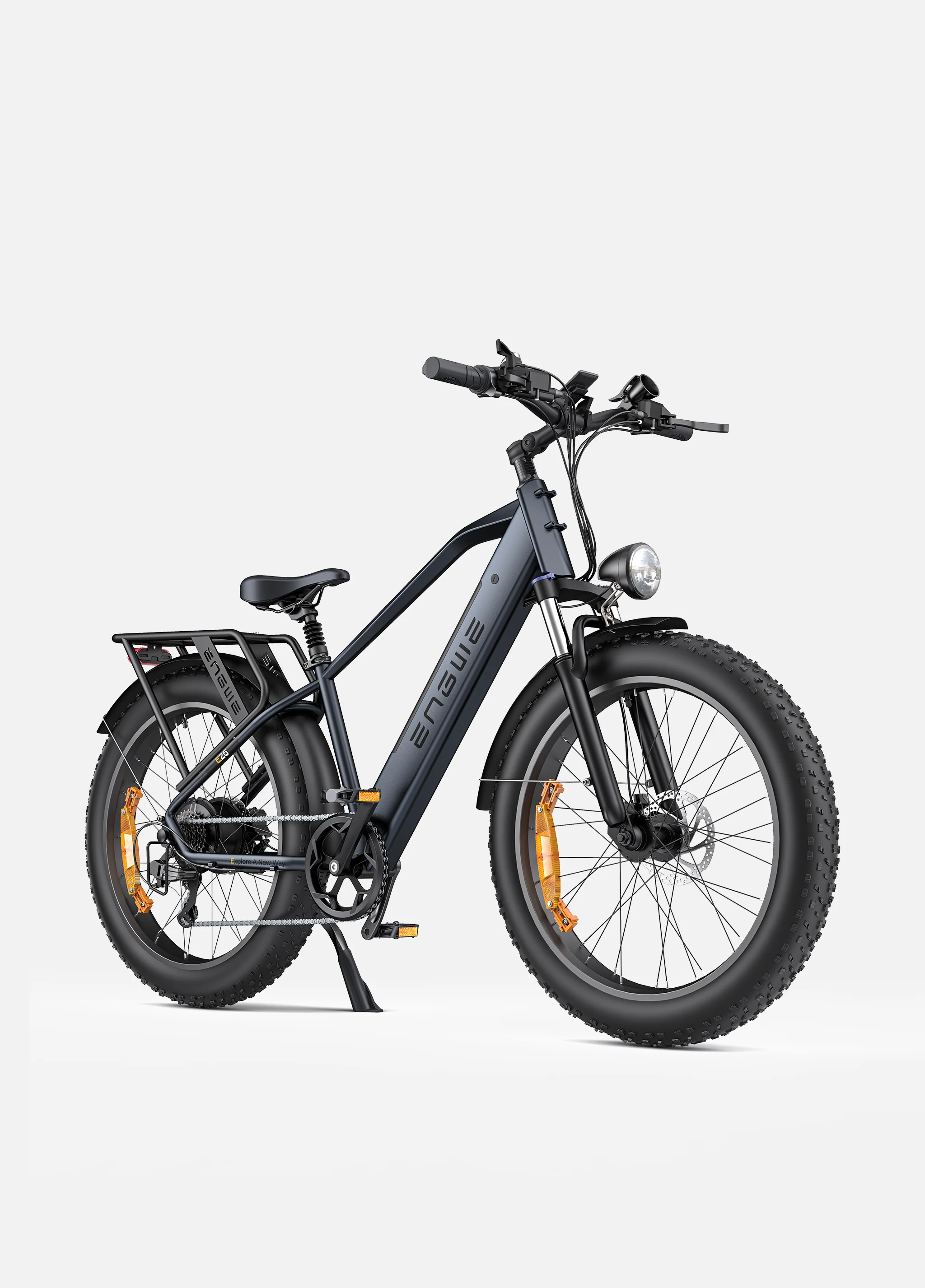 The Engwe E26 is a versatile electric fat tire bicycle designed for both off-road adventures and urban commuting. This innovative e-bike combines powerful performance with all-terrain capabilities, making it the ideal choice for those who want a reliable and efficient mode of transportation. Whether you're navigating rugged trails or commuting through the city, the Engwe E26 meets diverse needs with style and functionality.
